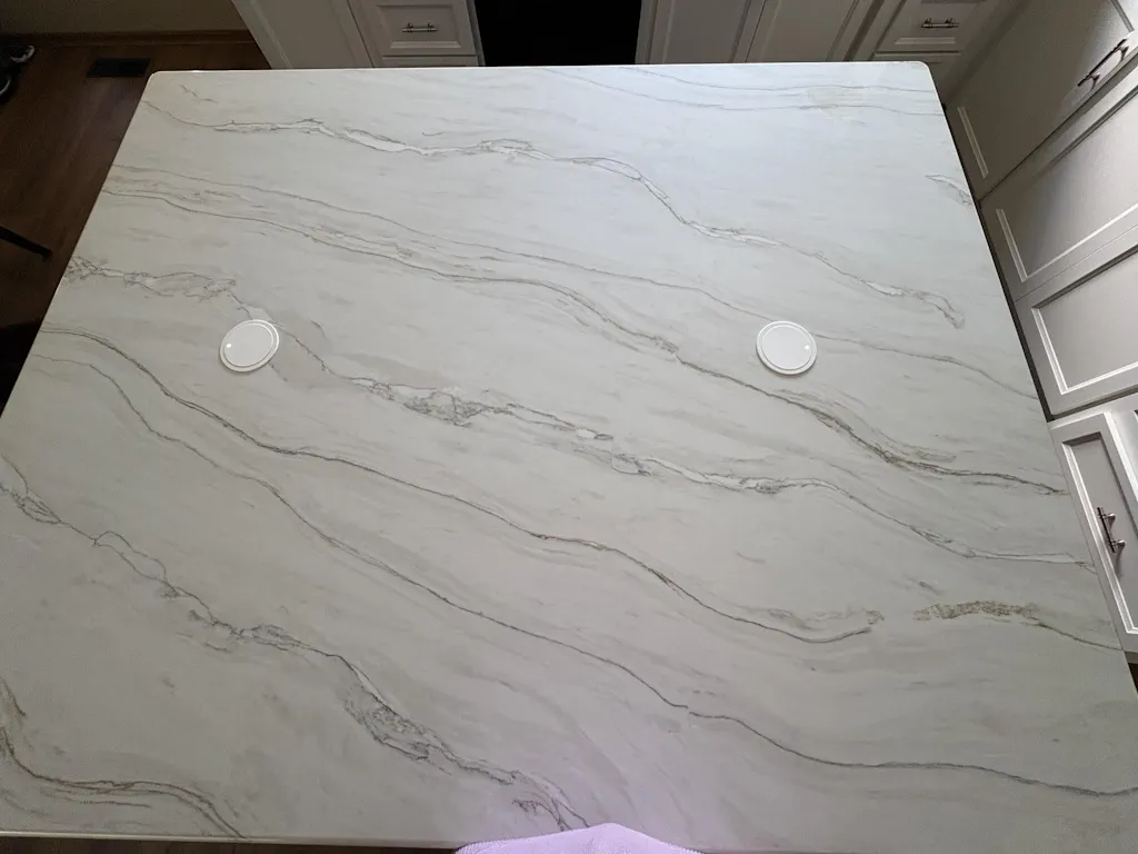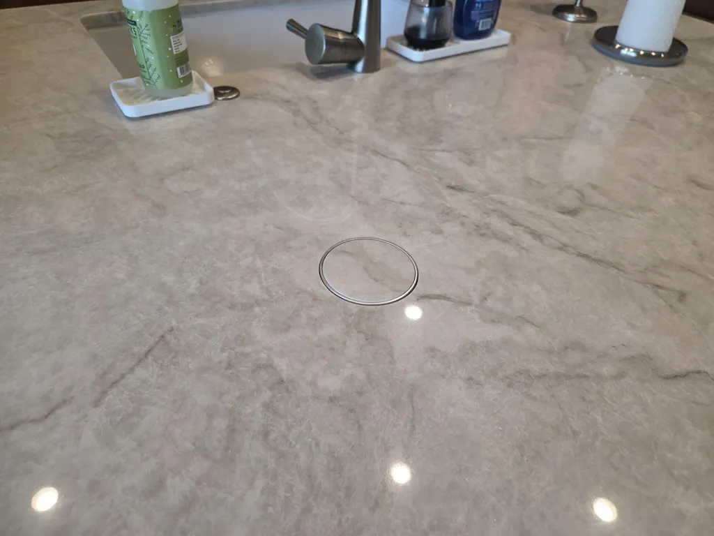 The Pops Ups look great in our new kitchen island. We got one large piece of quartz and the pop ups look amazing with the quartz on the top. They pop up and go down easily. I definitely recommend this product. It is a little more expensive than the ones without quartz on top but it's worth it.